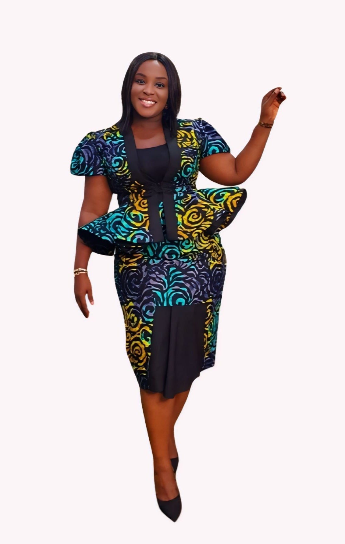 PLEASE NOTE: THE SKIRT OF THIS OUTFIT IS MADE WITH THE ANKARA MATERIAL AS PICTURED WITH A SLIT IN THE BACK. IT DOES INCLUDE THE PLEATED CREPE FABRIC IN THE FRONT (BLACK PIECE) AS SHOWN ON THE MODEL