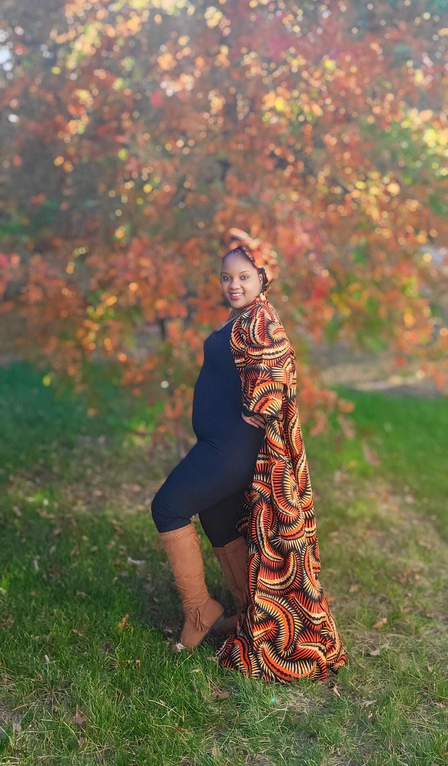 This African Print Kimono is very comfortable and stylish. The Kimono has an open front, ¾ sleeves, and a matching head wrap. This long kimono hits around the ankle for full body coverage. The over-sized, loose fit makes it comfortable to wear all day long. It is great for spending time with friends, running errands, or lounging around the house. Available in ONE FREE SIZE. Will fit fit up to a 54" bust and is 60" long.