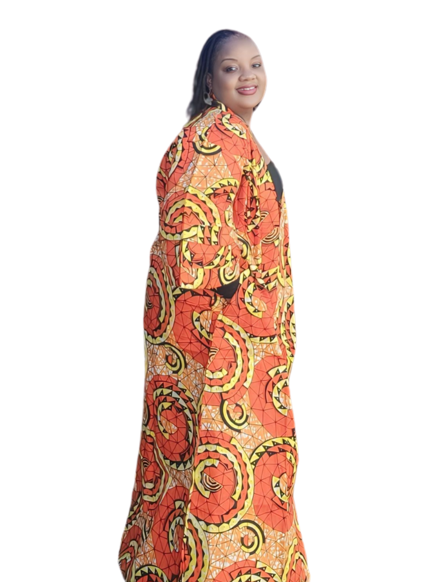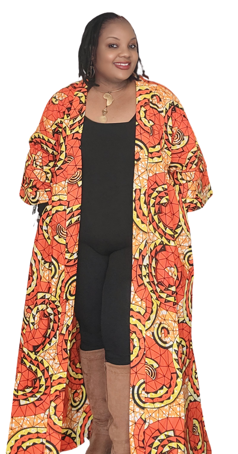 This African Print Kimono is very comfortable and stylish. The Kimono has an open front, ¾ sleeves, and a matching head wrap. This long kimono hits around the ankle for full body coverage. The over-sized, loose fit makes it comfortable to wear all day long. It is great for spending time with friends, running errands, or lounging around the house. Available in ONE FREE SIZE. Will fit fit up to a 54" bust and is 60" long.