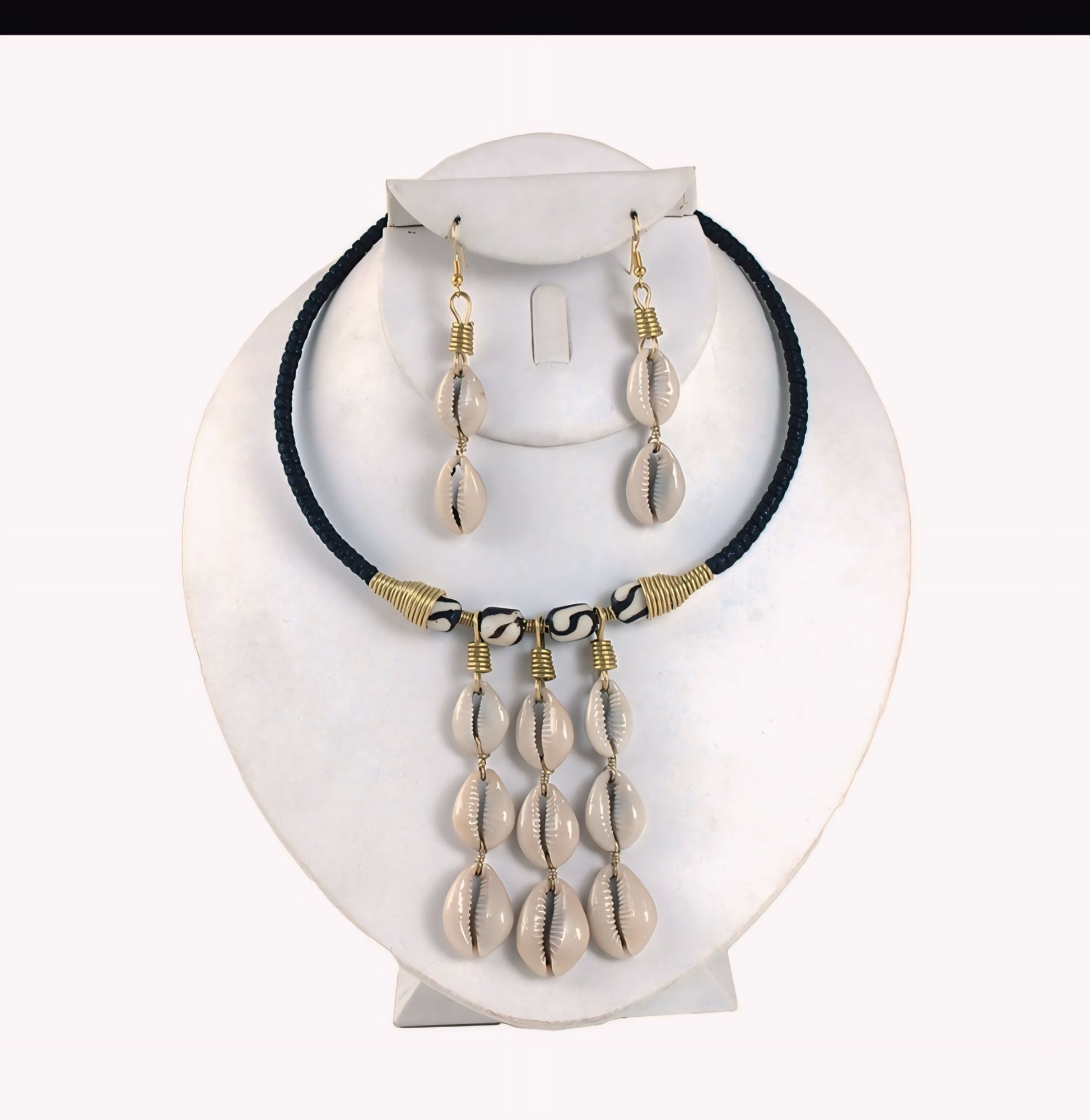 Unleash the power of the cowrie shell with our Ade Cowrie Shell Jewelry Set! This set features a black choker with golden coils, adorned with polished white cowrie shells that symbolize both spiritual connection and earthly wealth. The matching earrings showcase two dangling cowrie shells each. Handcrafted in Kenya, this set radiates Africa's rich tradition and elegance.