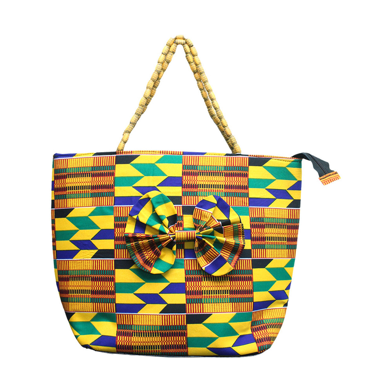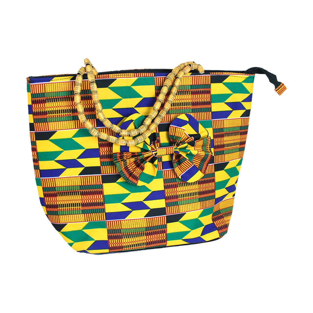 Show off your sense of style with Yaa's African Bow-Beaded Tote Bag. Boldly crafted in Ghana, this bag features an African Print design with an intricate beaded handle and bow on the front. The interior pocket and vinyl base provide additional storage and durability. Perfect for carrying all of your daily necessities, this 16" wide and 12" tall handbag is ideal for the confident fashionista. Experience African style with Abina's Bow-Beaded Tote Bag.