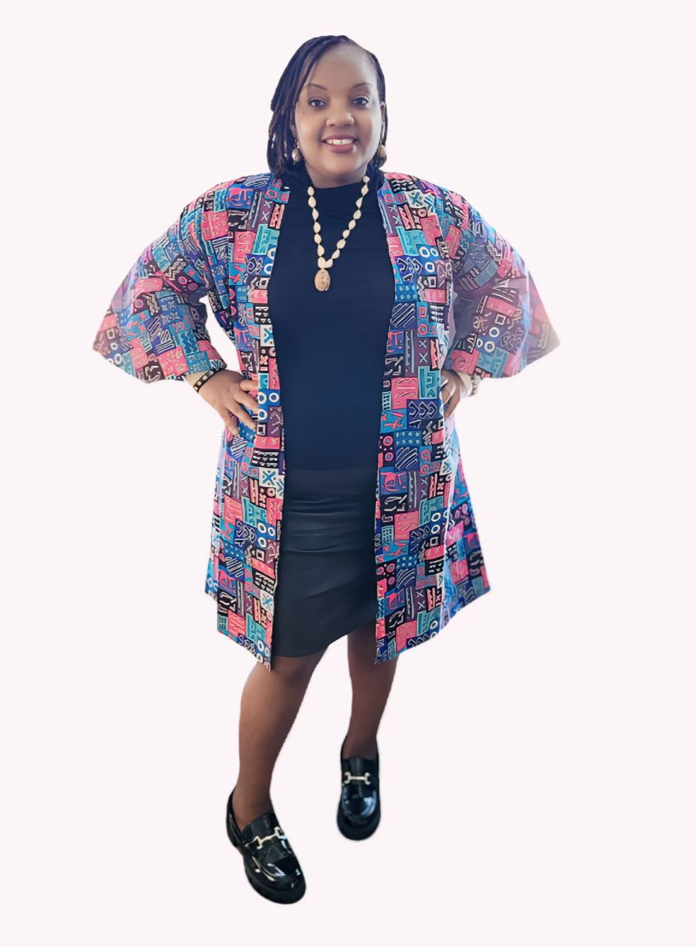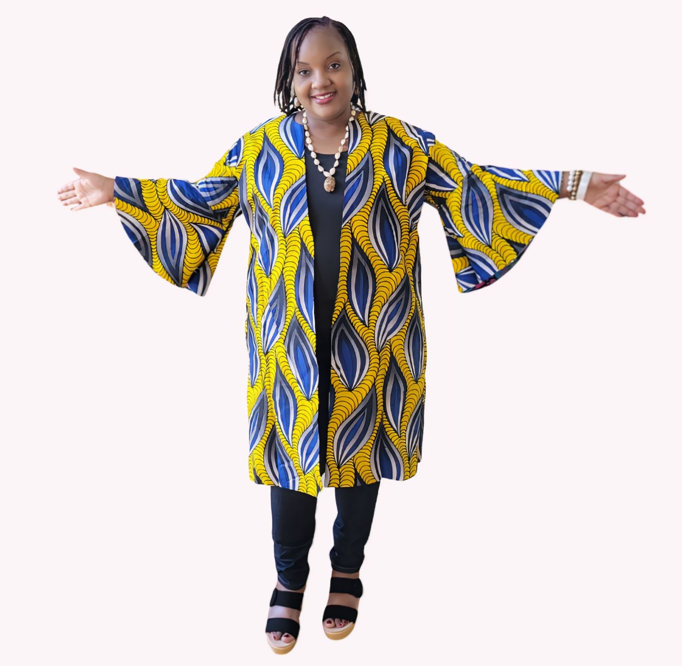 Transform your wardrobe with the Ade's luxurious Ankara Reversible Jacket. Crafted with vibrant African print, this versatile piece boasts a belled sleeve and a waist belt for a flattering silhouette. Each side showcases a unique print, while a coordinating head wrap adds the perfect finishing touch. Elevate your style and make a statement with this exquisite knee length jacket.