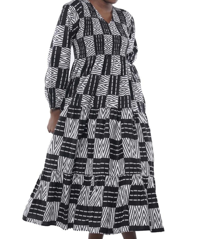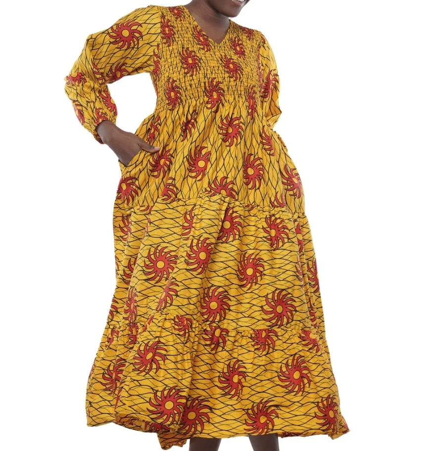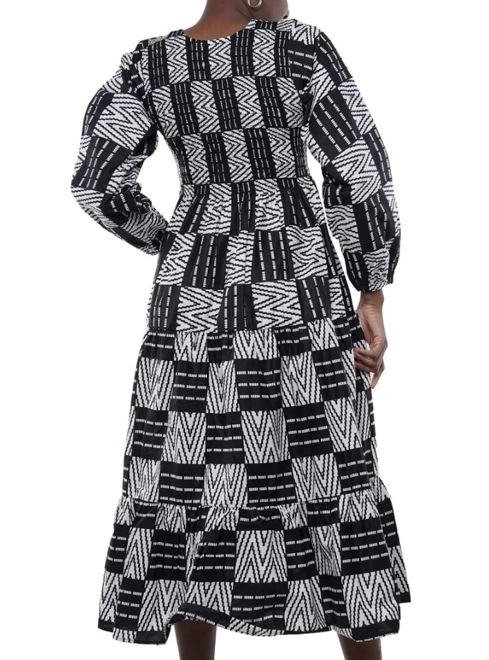 Elevate your wardrobe with a touch of elegance and a splash of culture! Our Smocked Tiered Maxi Dress is not just a dress; it's a statement piece designed for the bold and beautiful. This printed smoked dress features a V-neckline and a tiered, flared hem. A stylish choice, it is sure to be a fantastic enhancement to any wardrobe.