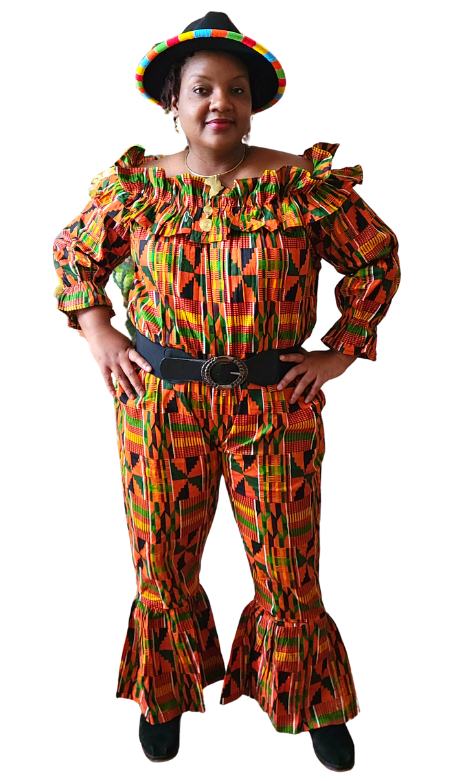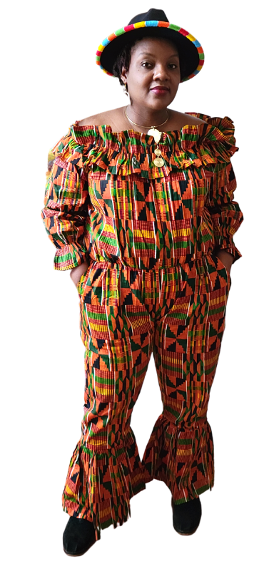 Add some flare to your wardrobe with this Kente Flare Bottom Jumpsuit. With a flared ruffle neckline, 3/4 sleeves, and bell bottom flares at the bottom of each pant leg, this jumpsuit has a fun, retro look that's perfect for the confident fashionista. It includes two pockets so you can keep your necessities close by. It also includes a head band for easy accessorizing. Great for casual wear, this jumpsuit can be worn as is or you can try adding a belt for an extra fashionable touch.