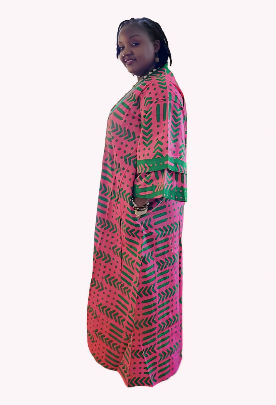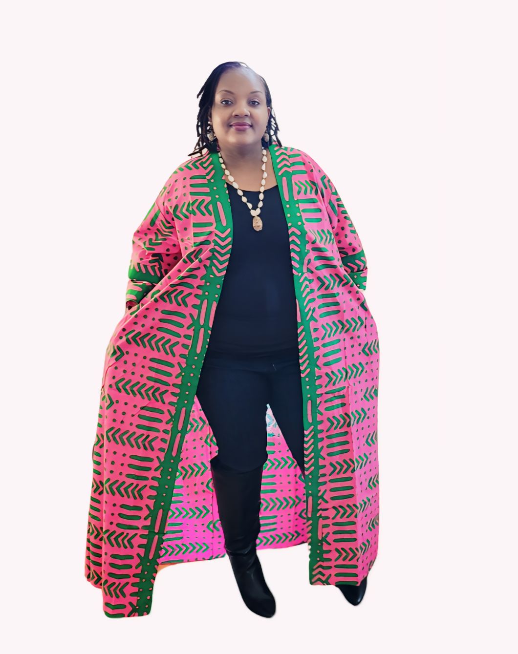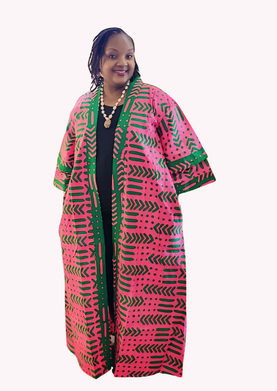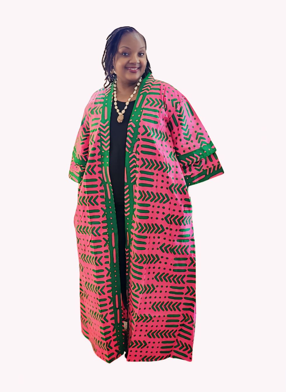This African Print Kimono is very comfortable and stylish. The Kimono has an open front, ¾ sleeves, and a matching head wrap. This long kimono hits around the ankle for full body coverage. The over-sized, loose fit makes it comfortable to wear all day long. It is great for spending time with friends, running errands, or lounging around the house. Available in ONE FREE SIZE. Will fit fit up to a 54" bust and is 60" long.
