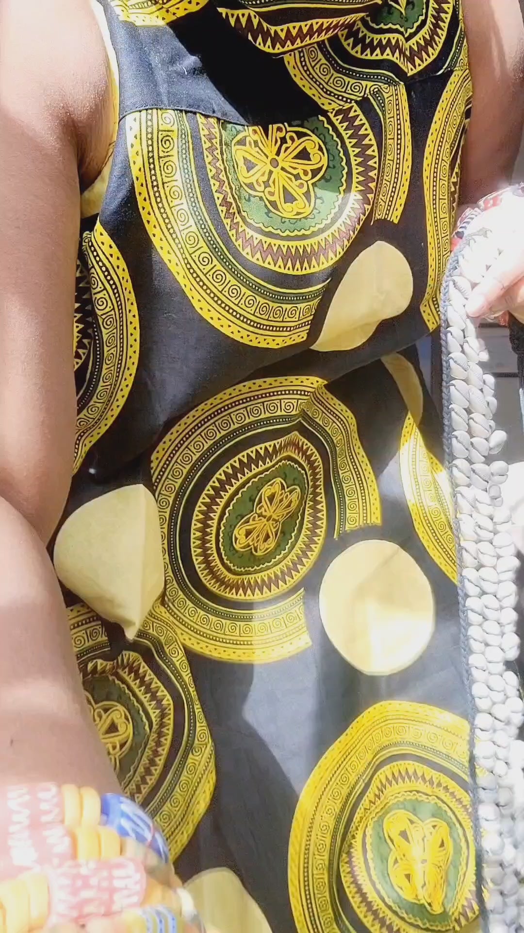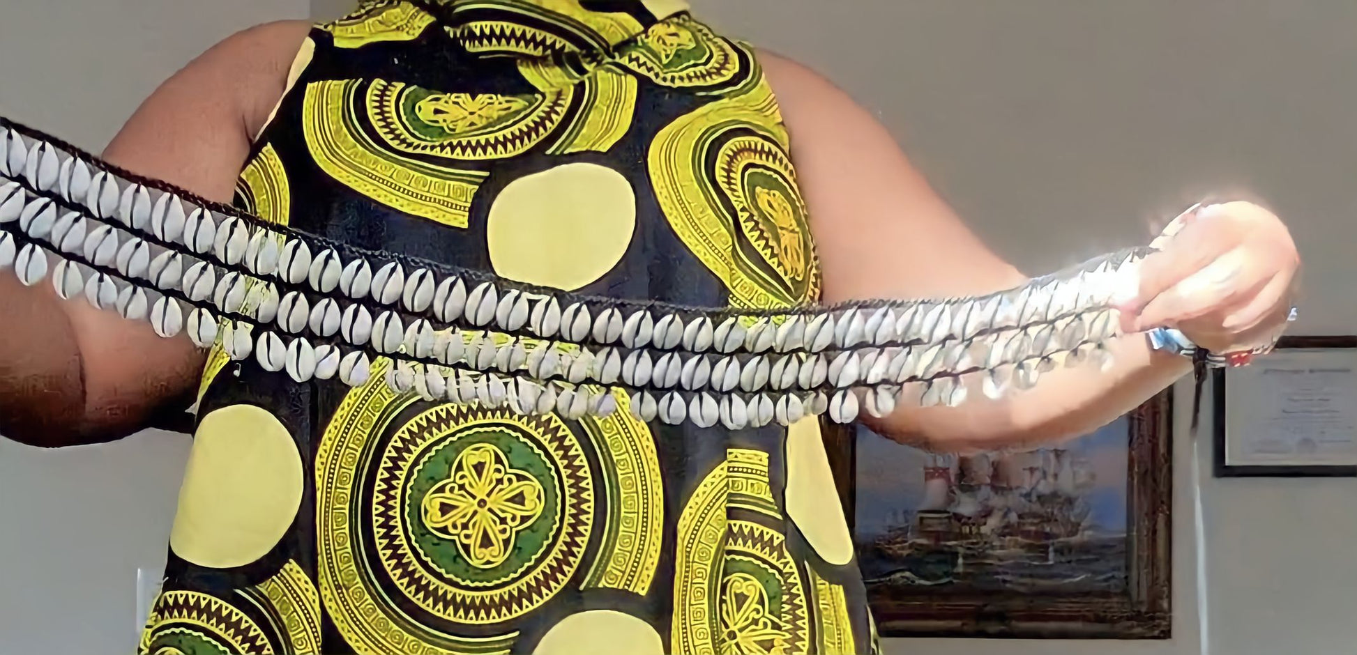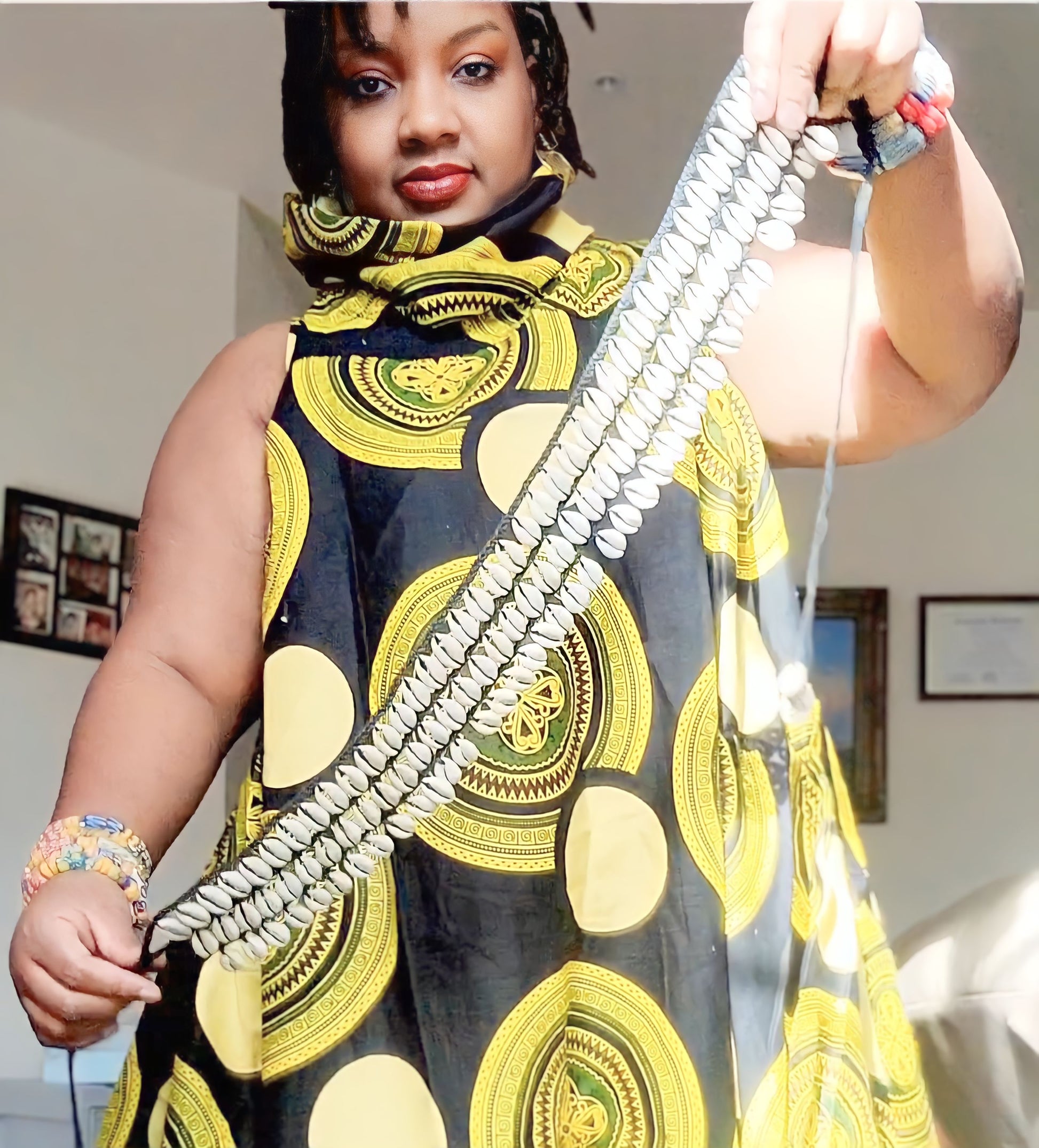 Elevate your style with Yassa's Triple-Row Cowrie Shell Belt. Hand-braided leather strips, stacked and adorned with individually stitched cowry shells, create an eye-catching, tiered effect. Finished with black glass beads and split straps for a polished look. Tie it off at 47" for a perfect fit. Be bold, be unique!