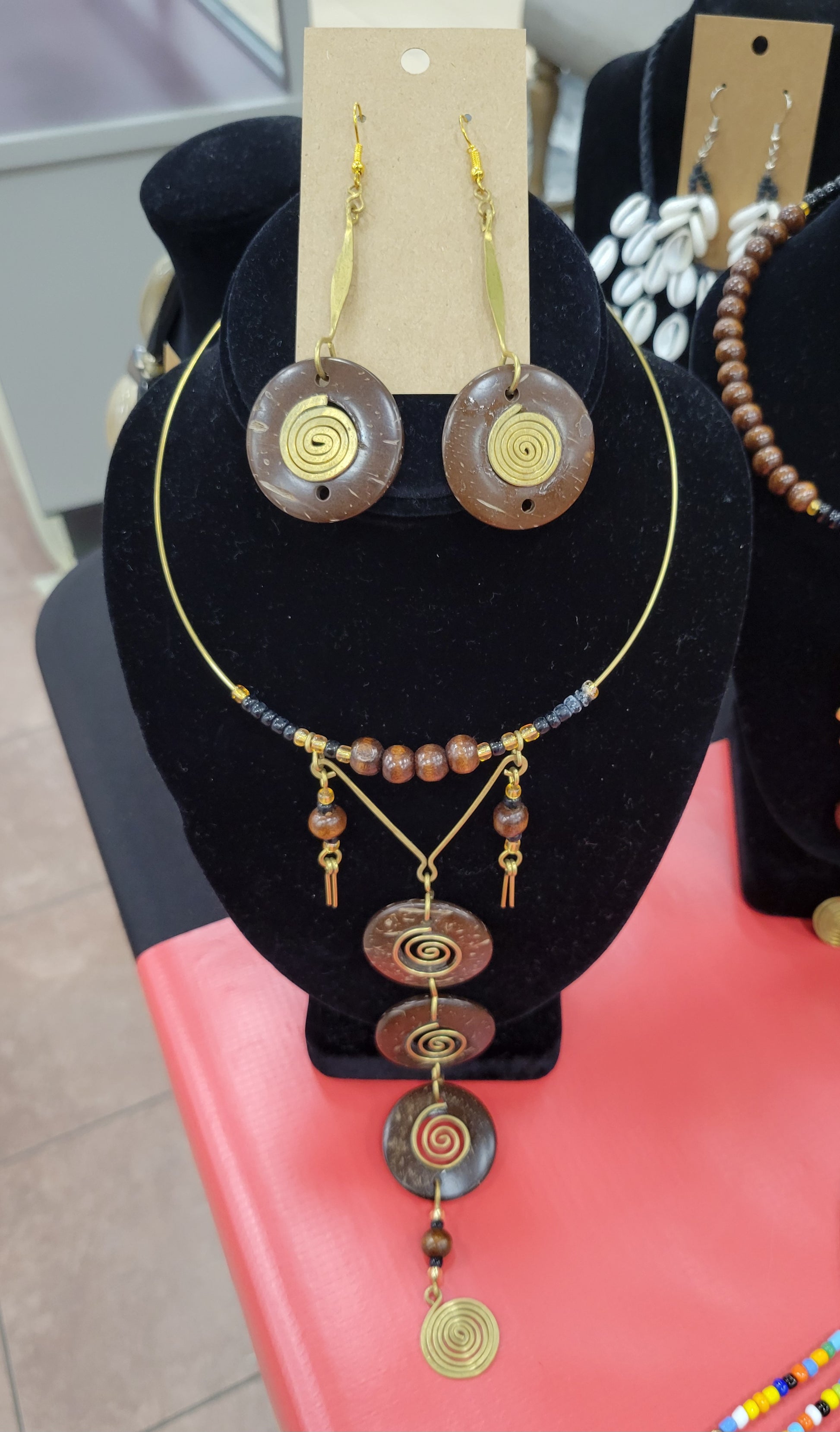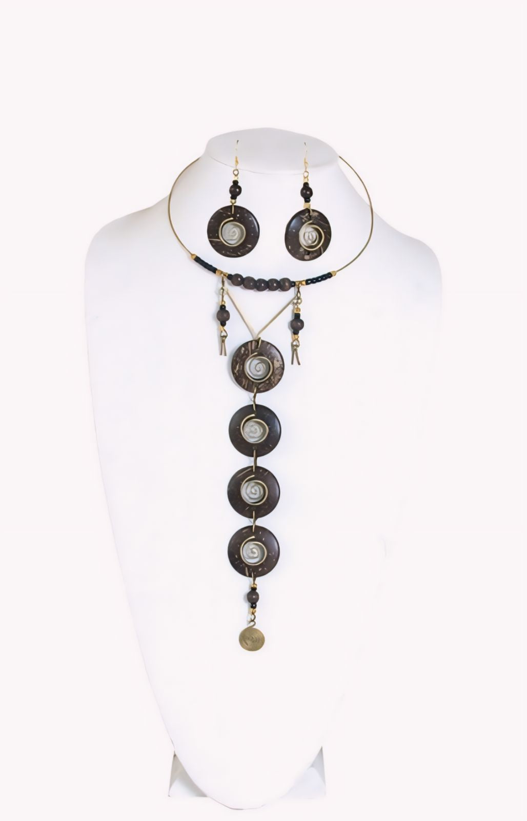 Stand out in the crowd with the Yatta-Zoe Cowrie Coconut Shell Set. Featuring a stunning design of brass swirls and circular bone pendants, this choker set exudes an African feel. Coordinated earrings complete the look. Made in Kenya.